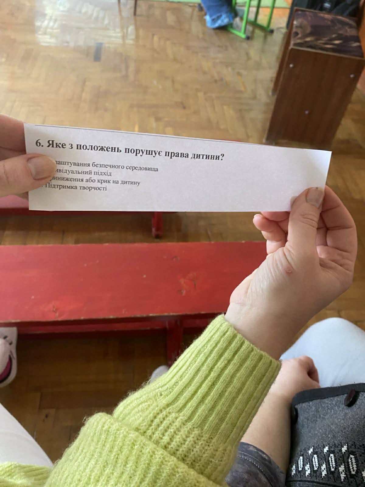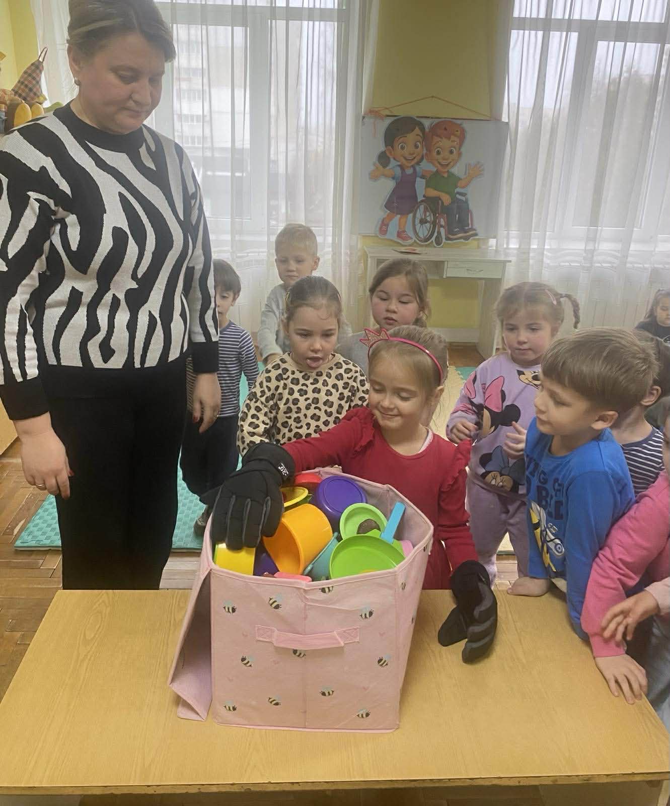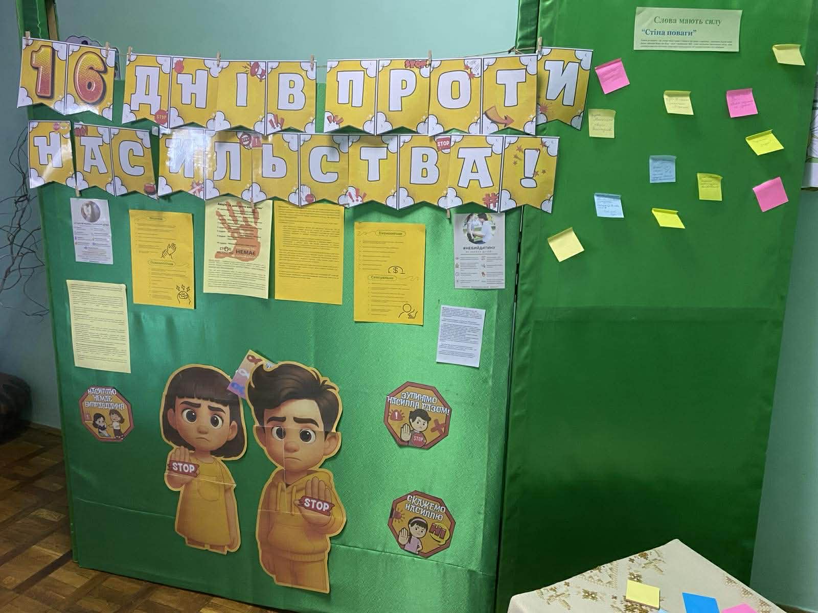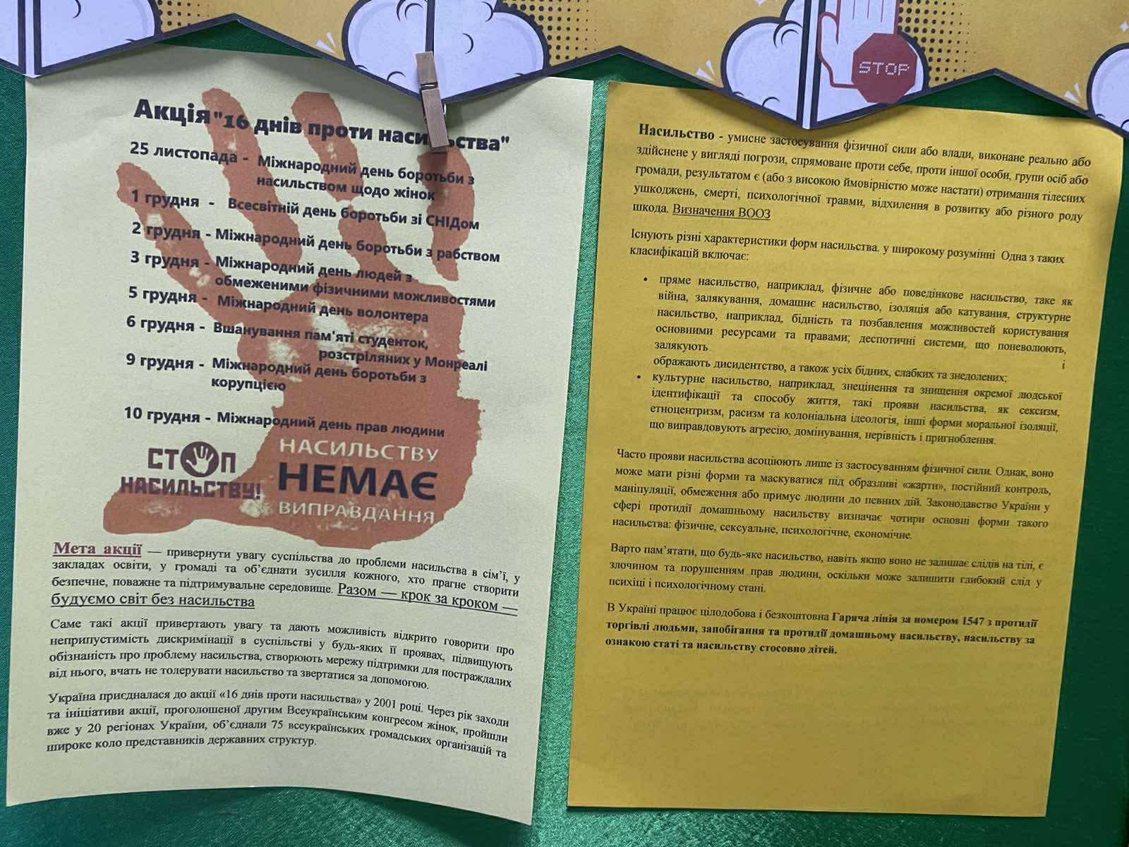 Щодня наш колектив працює над тим, щоб ДНЗ №6 ” Теремок” залишався простором поваги, безпеки та взаємної підтримки. Тому кожного року ми долучаємось до Міжнародноі акціі «16 днів проти насилля» , яка триває з 25 листопада по 10 грудня День 1. Світова солідарність Педагоги, почепивши білу стрічку на одяг, висловили свою позицію щодо неприйняття усіх видів насилля. Практичний психолог Ірина Щербанік провела інформаційну хвилинку для педагогів, акцентувавши на важливості нульової толерантності до будь-яких проявів агресії. Підкреслила, що небайдужість, своєчасне реагування й підтримка — основа власної безпеки та кожної дитини. Кожний день відзначався певною активністю :”Рух проти Злості” (танцювальні рухи, як позитивна енергія) ;“Стоп! Дихай! Живи!”(як розпізнати злість і не вдарити, не образити);”Слова мають силу”( символічна ” стіна поваги”, кожна добра фраза, написана батьками для працівників ДНЗ, стала маленьким промінчиком світла, який допомагає нам усім пам’ятати: слова мають силу надихати, об’єднувати й робити світ добрішим) До Міжнародного дня людей з інвалідністю практичний психолог провела інтерактивну бесіду з старшими дошкільниками « Я можу бути твоїм другом» Спокійно, добираючи зрозумілі для дітей слова, через ігри « Чим ми відрізняємось ?» « Мені подобається…»психолог донесла дітям, що люди різні і це нормально. Усі особливі по-своєму, тому дізнаватися про особливості кожної людини і враховувати їх, – це важливо й цікаво. Через персонажа – хлопчика Тарасика , на кріслі колісному і його подружки Оленки діти дізналися , що люди з інвалідністю можуть перемагати у змаганнях, конкурсах, брати участь у житті суспільства. Через інтерактивні вправи діти відчули з якими труднощами можуть зустрічатися люди з інвалідністю і яким чином можна їх підтримати. Завершилась акція Міжнародним днем прав людини. Кожна доросла людина чітко розуміє, що вона наділена певними правами. І ці знання закріпили педагоги у вікторині ” Знавці права”. Але чи знає про це дитина? Це питання розкривала психолог із старшими дошкільниками. Сторінками улюблених казок діти визначали порушені права казкових героїв, підбирали символи до зазначеного права, пригадали свої обовʼязки . Усі заходи проведені в атмосфері довіри і відкритості. Єднаймося заради майбутнього без насильства!